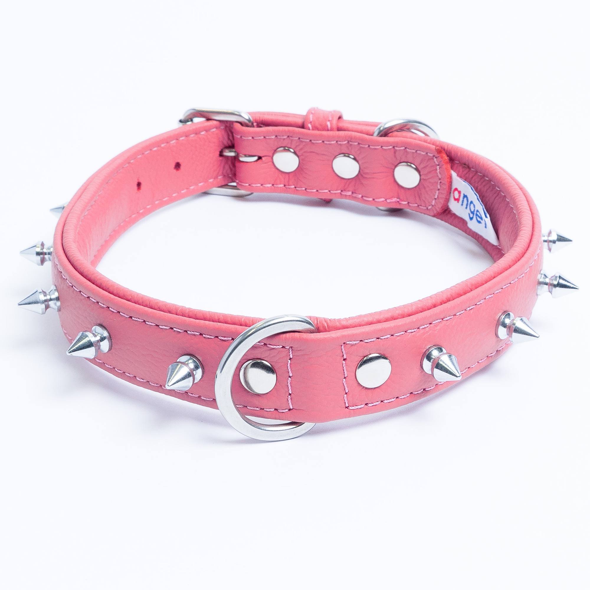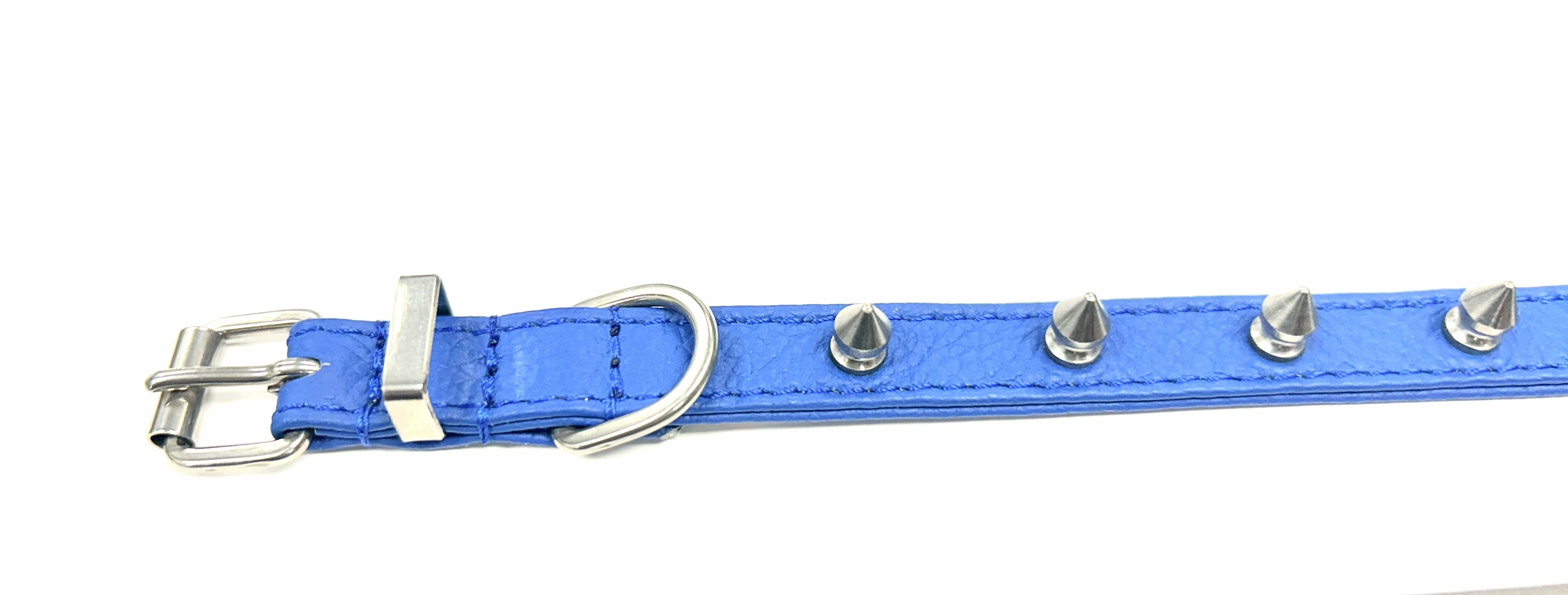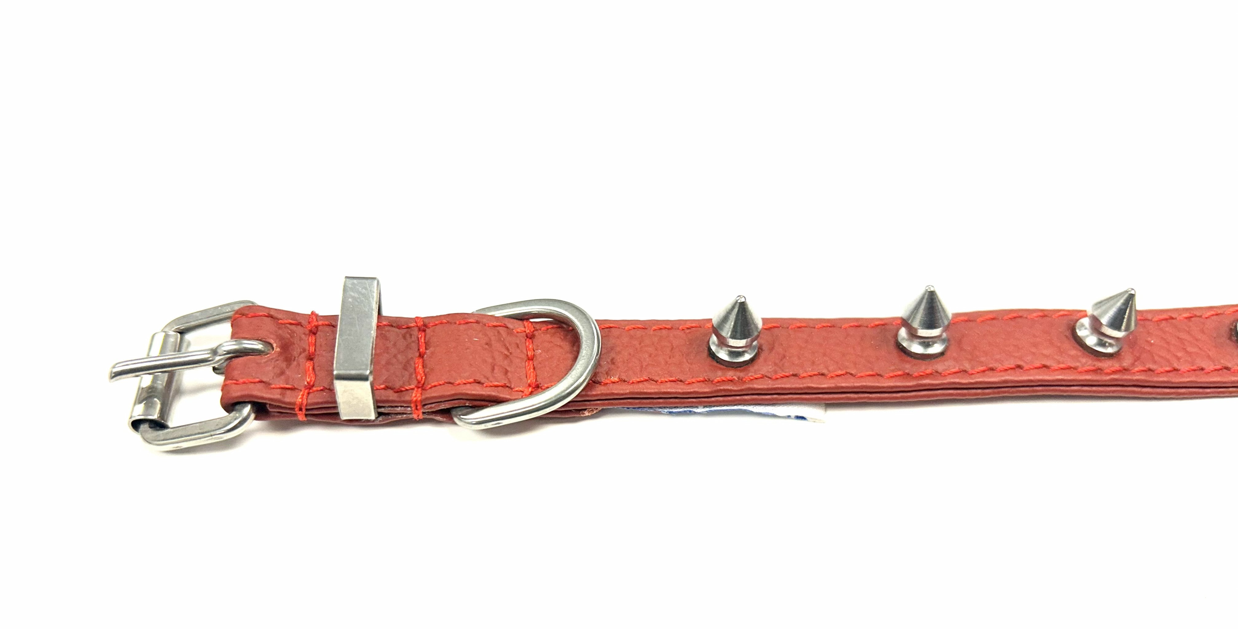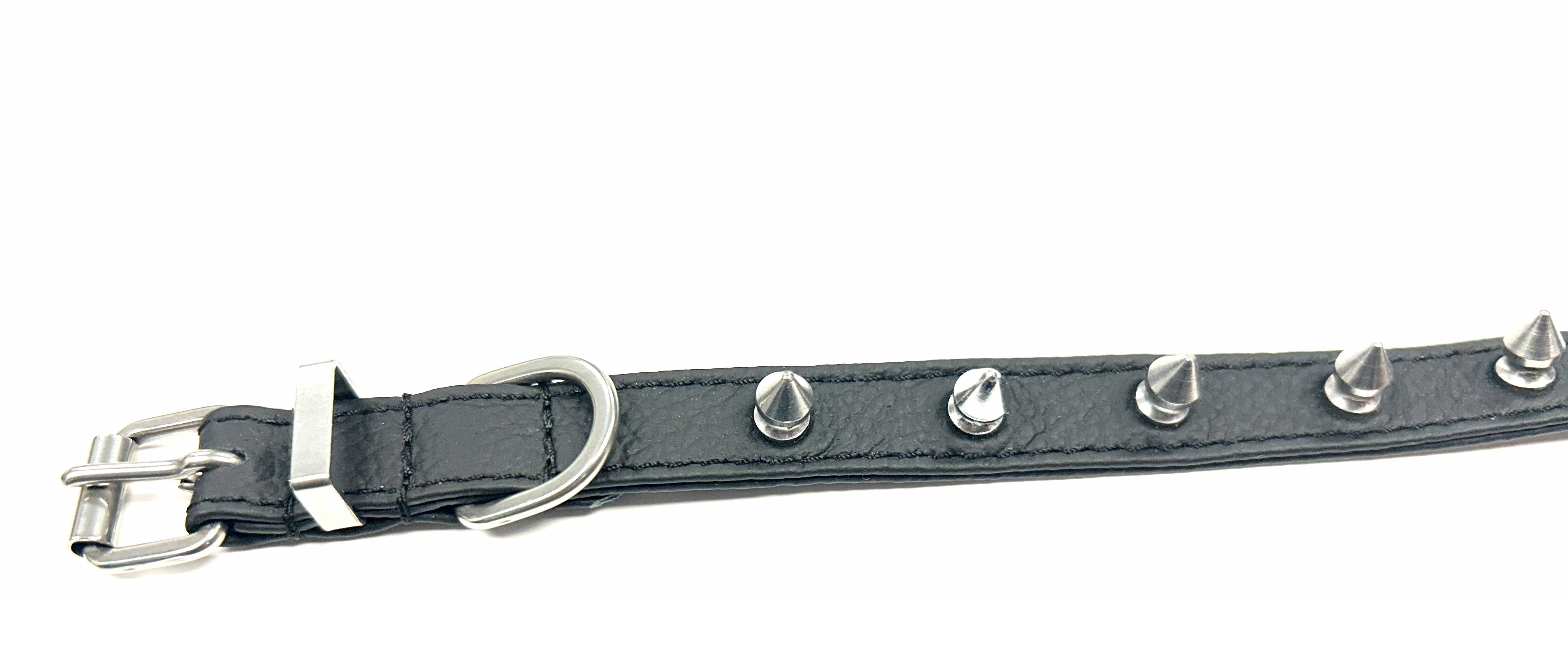 One of our top-selling designs, these single-line spiked collars will give your dog the personality they deserve. The chrome-plated spikes are securely fastened to the soft genuine leather along with stainless steel rings and buckle. You and your dog will make a bold statement with this fabulous collection.